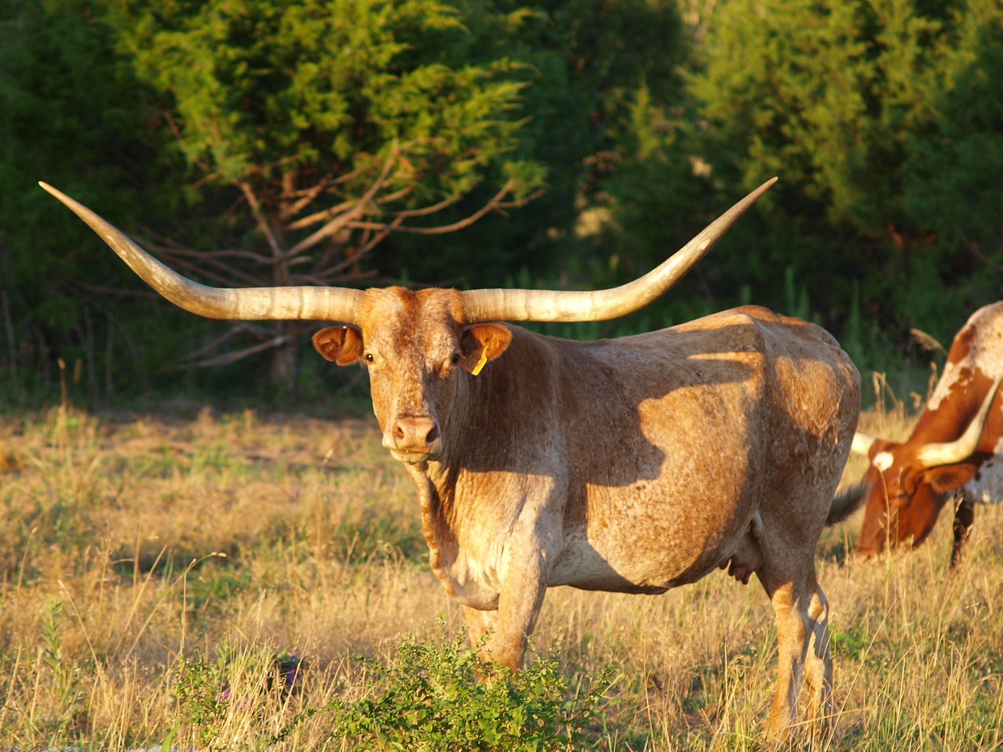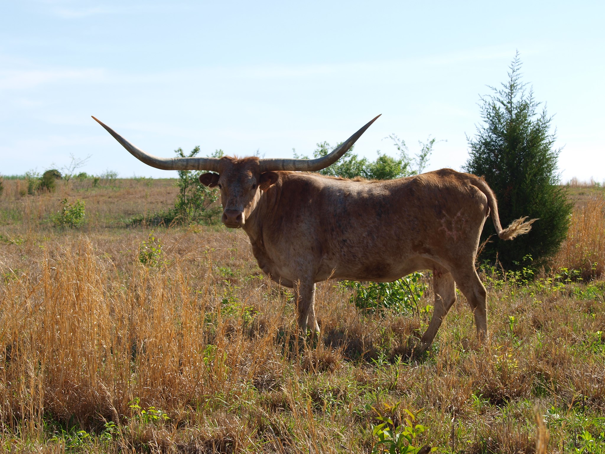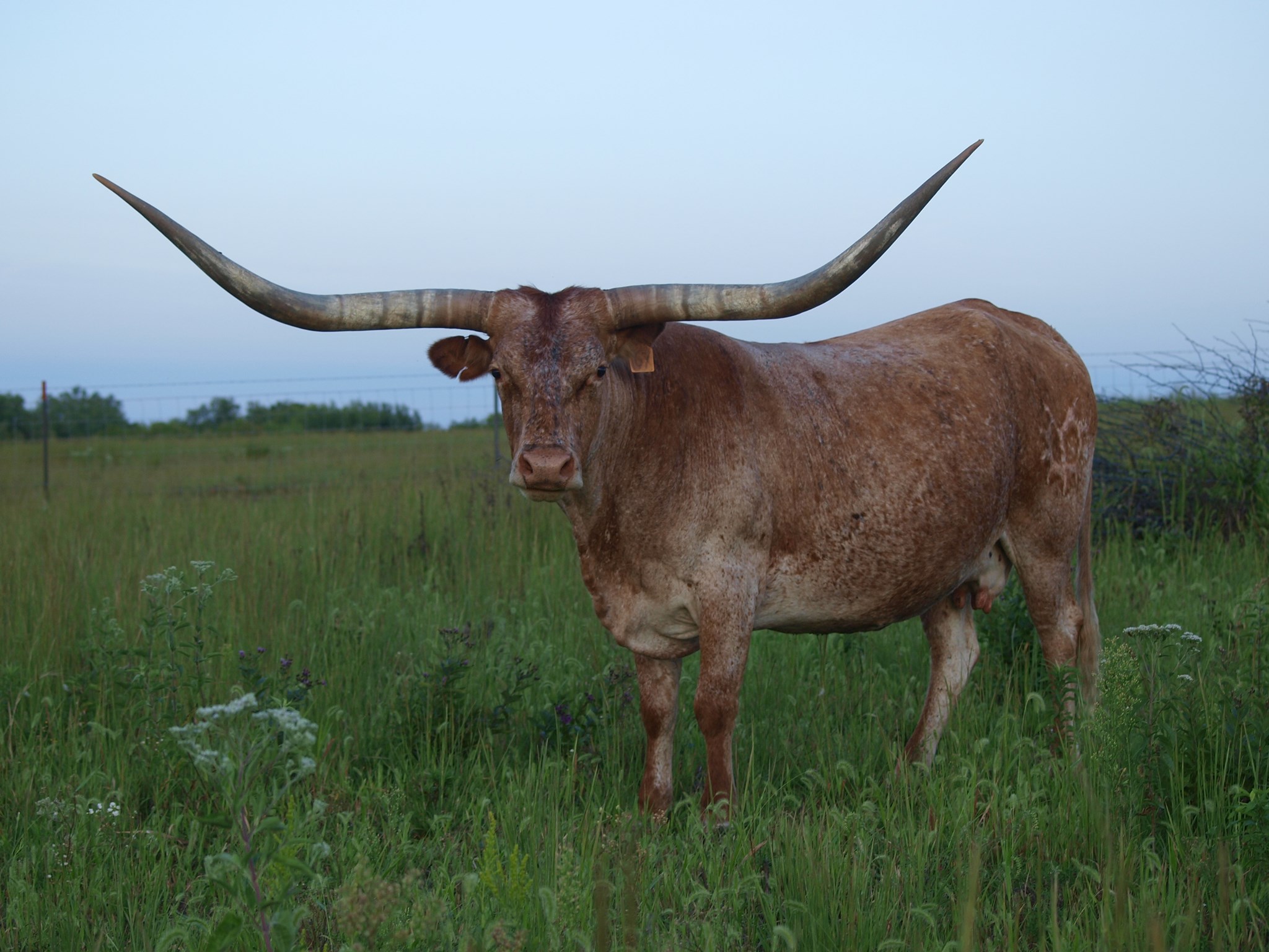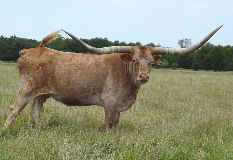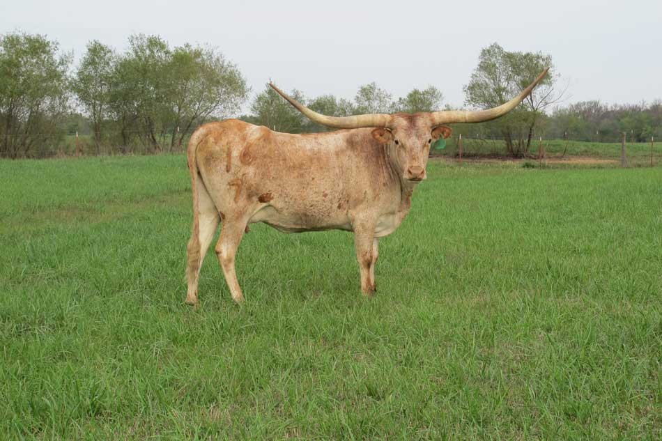 This is one of my favorite Maximus ST daughters and one of our best producers. She is huge horned. Inside of her spots is a wonderful brindle roan.